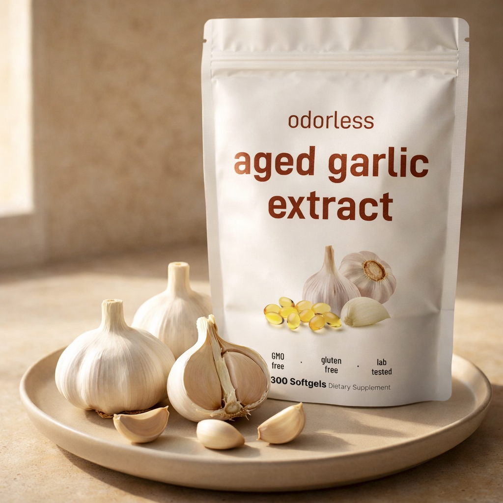 No — aged garlic extract is naturally odour-controlled, so most people don’t experience the strong smell often associated with raw garlic supplements.